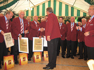 Den Dank des Sängerchor unterstrich der Vorsitzende mit der Übergabe entsprechender Ehrenurkunden und eines "guten Tropfens" zur Stimmpflege: "Wir alle hoffen, dass ihr noch viele Jahre bei guter Gesundheit in unserer Chorgemeinschaft aktiv mitwirkt!" Die Sänger gratulierten mit dem musikalischen "Hoch". Besonders passend auch "Jahre kommen, Jahre ziehen..." von Rudi Kühn, bei dem sicher jeder Jubilar sein Sängerleben im Zeitraffertempo Revue passieren ließ. Der Festabend ging anschließend mit Musik und bejubelten Künstlerauftritten weiter.