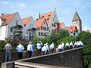 Auch dieser Liedvortrag wurde mit großem Beifall belohnt. Am Nachmittag startete der Chor in das ca. 30 Km entfernte Ulm um im berühmten Ulmer Münster dort ebenfalls einen Gottesdienst mitzugestalten. In Ulm angekommen empfing uns unsere ehemalige Vereinswirtin Kitty Höher. Sie hatte extra für uns zwei Fremdenführer organisiert, die uns ca. eine Stunde die Sehenswürdigkeiten des bekannten Fischerviertels zeigten.
