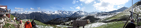 Großes Wetterglück begleitete uns am folgenden Tag beim Ausflug auf das Fellhorn. Mit der Fellhornbahn fuhren wir auf die Mittelstation (ca. 1800 m) wo uns Neuschnee erwartete. Von dort wanderten wir zur Schlapphold-Alpe (Deutschlands höchstgelegene Sennalpe). Mittlerweile lugte die Sonne hervor und ließ diesen Aufenthalt auf der Terasse zu einem tollen Erlebnis werden. Claudia Rübben-Laux und Jürgen Wunderlich stimmten abwechselnd Lieder an die ins Tal hinunterklangen und den Blick auf die Bergriesen noch großartiger erscheinen ließen. Am Abend stand dann noch der gemütliche Abend im Gasthaus "Münchner Kindl" an.
